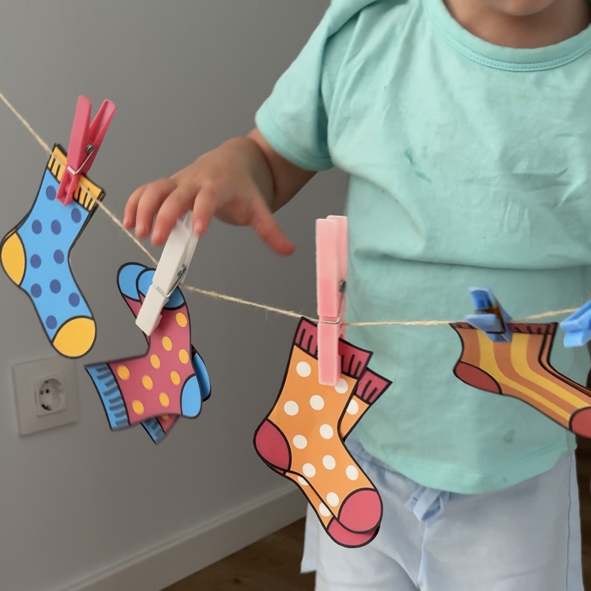 - Aparejamos calcetines – Recortaremos y plastificaremos los calcetines. Los emparejaremos y los colgaremos en una cuerda de tender.